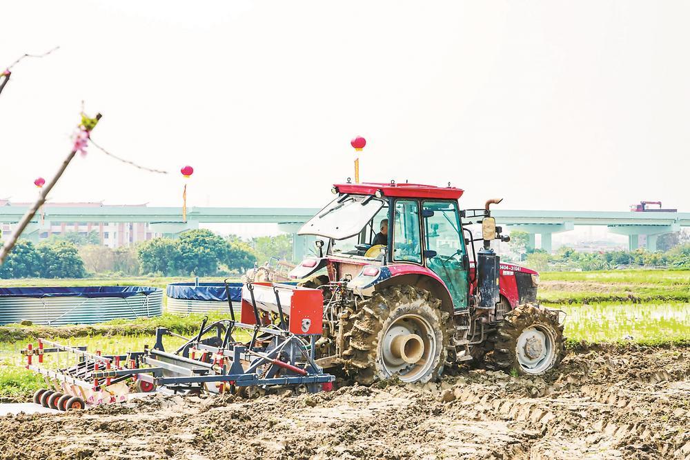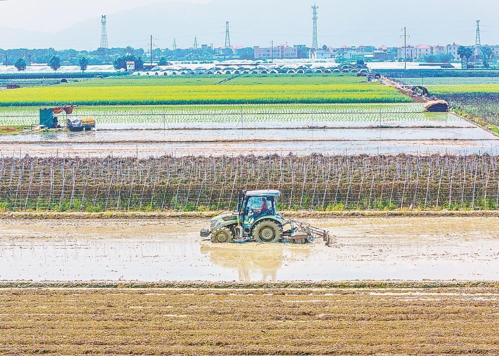 近日,在漳州市龍海區(qū)東園鎮(zhèn),農(nóng)戶駕駛農(nóng)機(jī)穿梭于水田中。福建日?qǐng)?bào)通訊員 陳逸帆 攝
