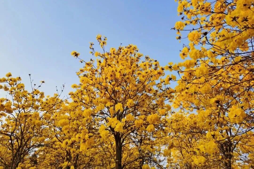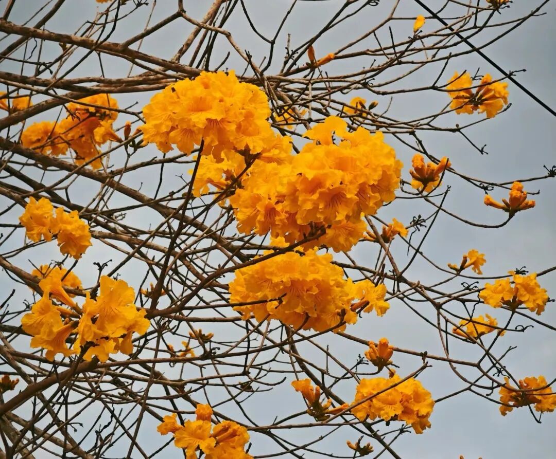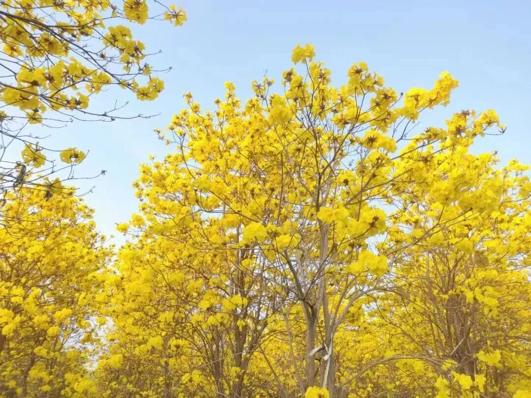 村莊道路兩旁的黃花風(fēng)鈴木肆意盛放,金黃色的花朵壓滿枝頭,遠(yuǎn)遠(yuǎn)望去,連綿不斷的金色花海在藍(lán)天的映襯下,明亮得晃眼,宛如大自然打翻了鎏金顏料盤,鋪就了一條通往春日的浪漫大道。微風(fēng)拂過,漏斗狀的花朵輕輕搖曳,像一串串被春風(fēng)搖響的風(fēng)鈴,簌簌落下的花瓣,給地面鋪上了一層柔軟的金色地毯,連空氣中都彌漫著春日的溫柔與明媚。