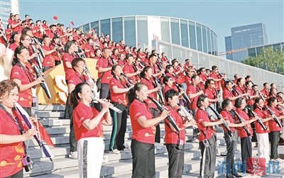 挑戰(zhàn)開始前,數(shù)百名電吹管演奏者在海上世界上演音樂快閃。記者 陳理杰 攝